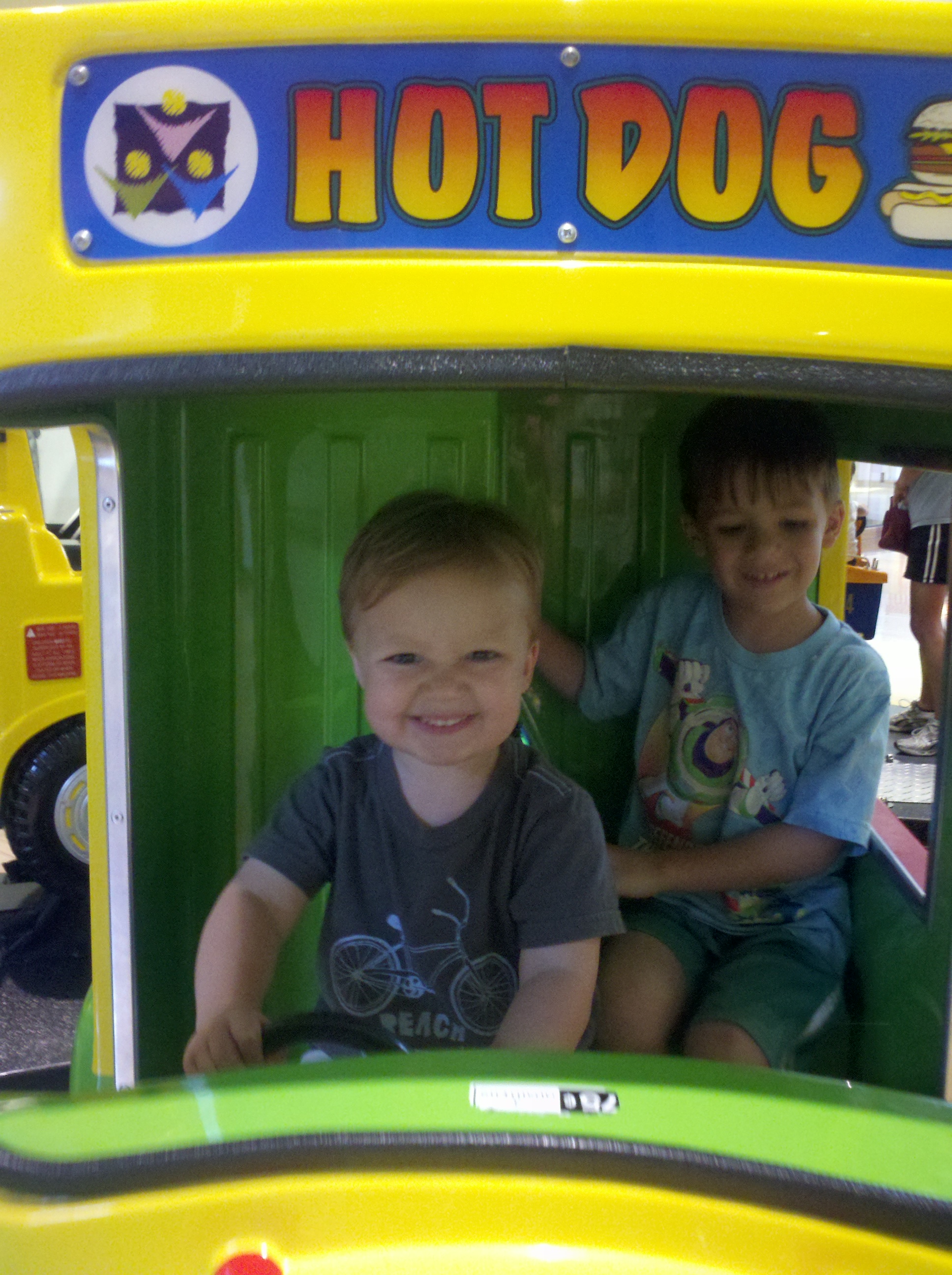 Good news: There are a bunch of those mechanical, ride-on cars at this mall, and I’ve got a bag full of quarters.