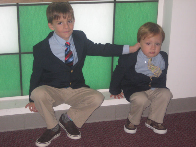 page 1: The boys are dressed in their Sunday best. They’re sporting matching blue blazers, ties, khakis, and—in what turns out to be a flash of brilliance by Mom & Dad—plaid Vans. Cute, comfy, and practical.