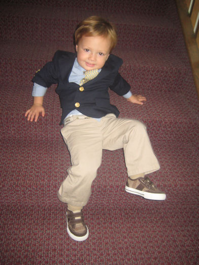 p. 4: Only 20 min. into the ceremony, we’ve been through a granola bar, 2 books, and the crayons. Riley’s shirt is untucked and his tie is askew. He keeps asking for candy. I keep saying, “IF you’re good, you can have some AFTER.” He keeps replying, “I AM good NOW” while kicking the pew in front of us.