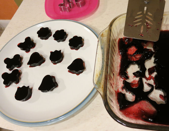 As I am dishing out the Jello, which I’ve cut into whimsical shapes with cookie cutters, I notice the dark purple gelatinous goo looks remarkably like entrails. Blood Jello, anyone? Perfect for Halloween.